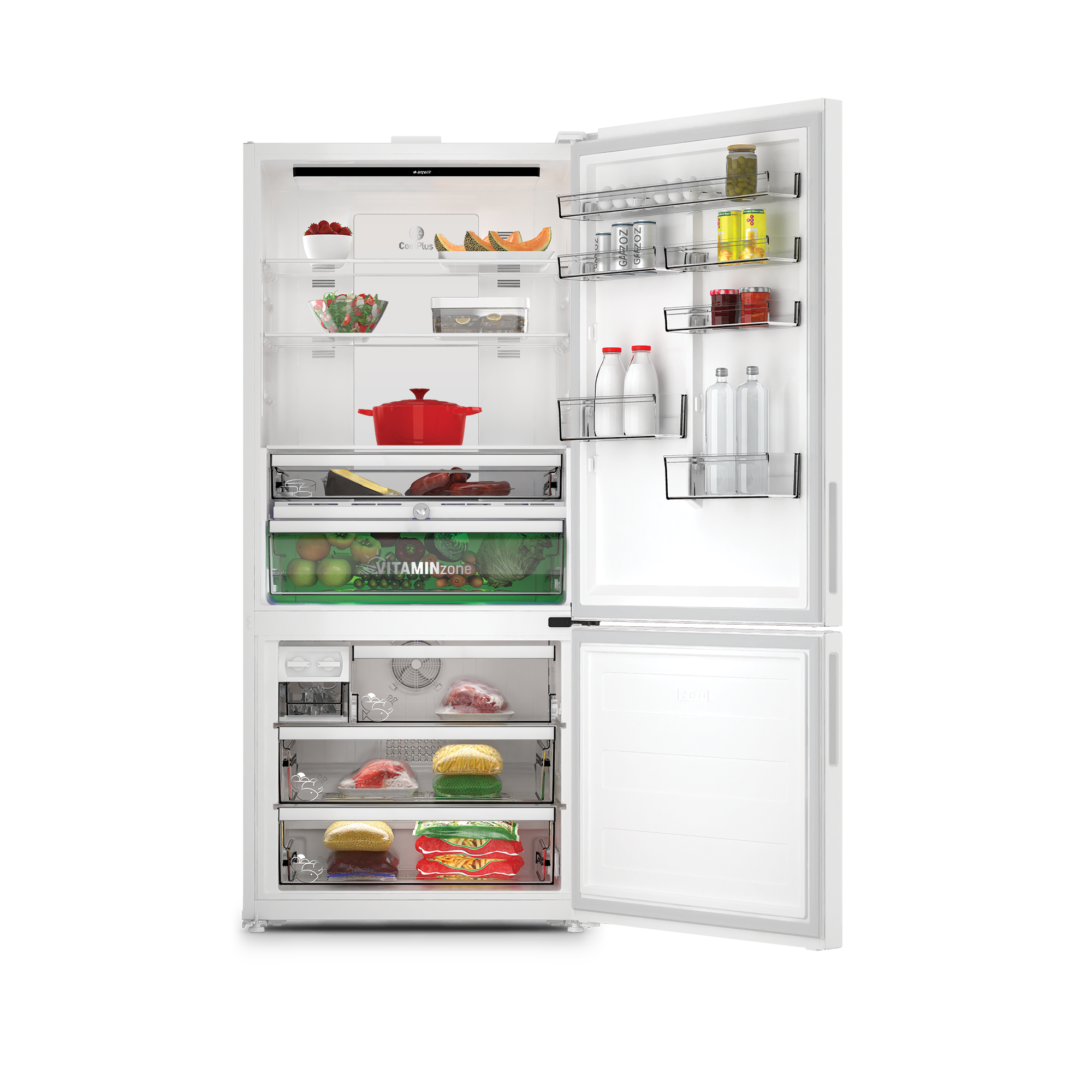 615 L toplam hacim, No Frost sistemi ve çift kapılı tasarımıyla geniş ailelerin tercih edebileceği alttan donduruculu buzdolabı.